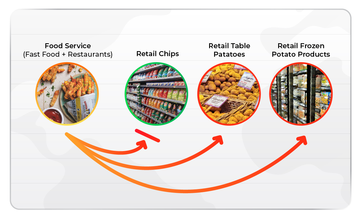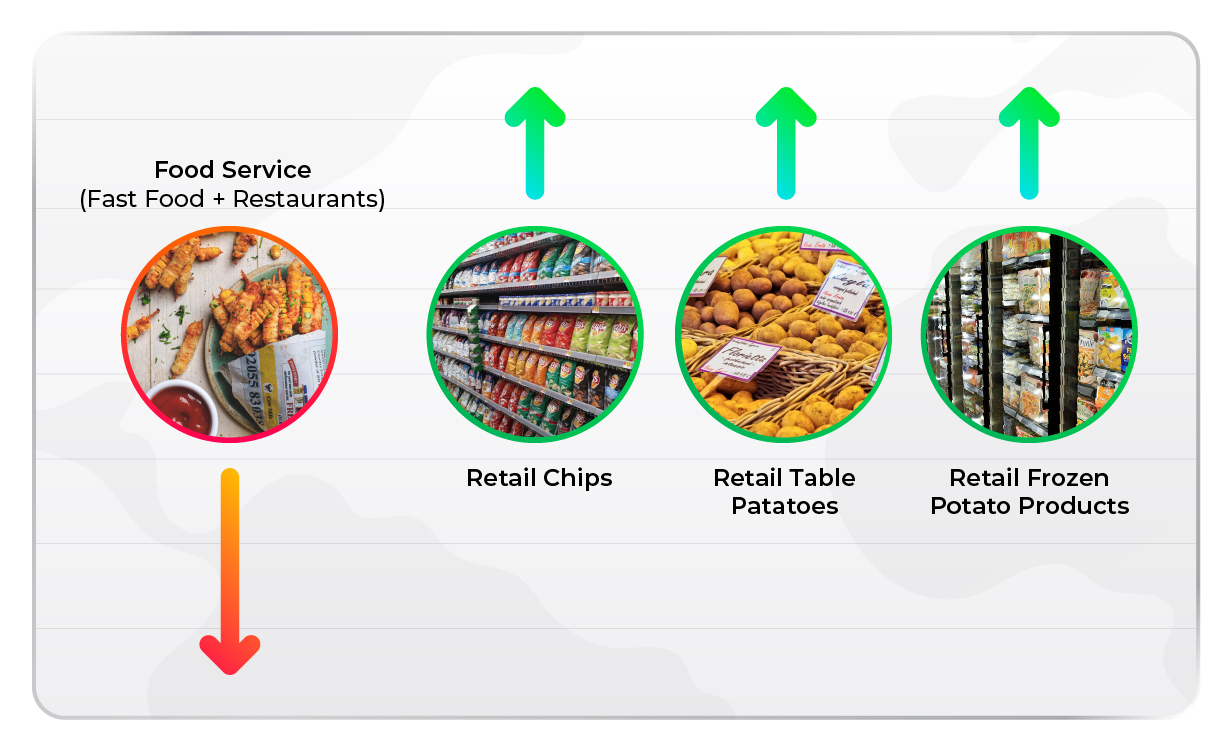 The potato industry was left in a state of imbalance. There was a severe supply glut for food service potatoes with no restaurants to sell through and at the same time there was a shortage of retail potatoes, as panicked consumers rushed to stock up on notoriously shelf-stable potatoes and potato chips.