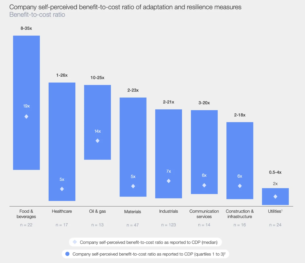 Research from the World Economic Forum in 2024 found that food and beverage companies are likely to benefit the most from climate adaptation investments, with an expected benefit-to-cost ratio of 19 times. In other words, for every dollar spent on adaptation for food and beverage companies, they would get $19 in return.